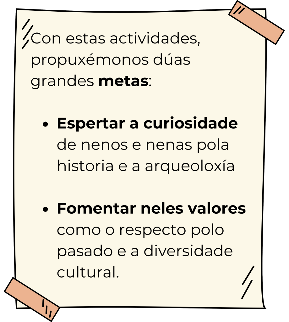 O noso obxectivo principal foi promover a Arqueoloxía en Comunidade para nenos e nenas da comarca, unha forma de achegar o coñecemento arqueolóxico á sociedade local e facela partícipe do seu propio legado patrimonial.