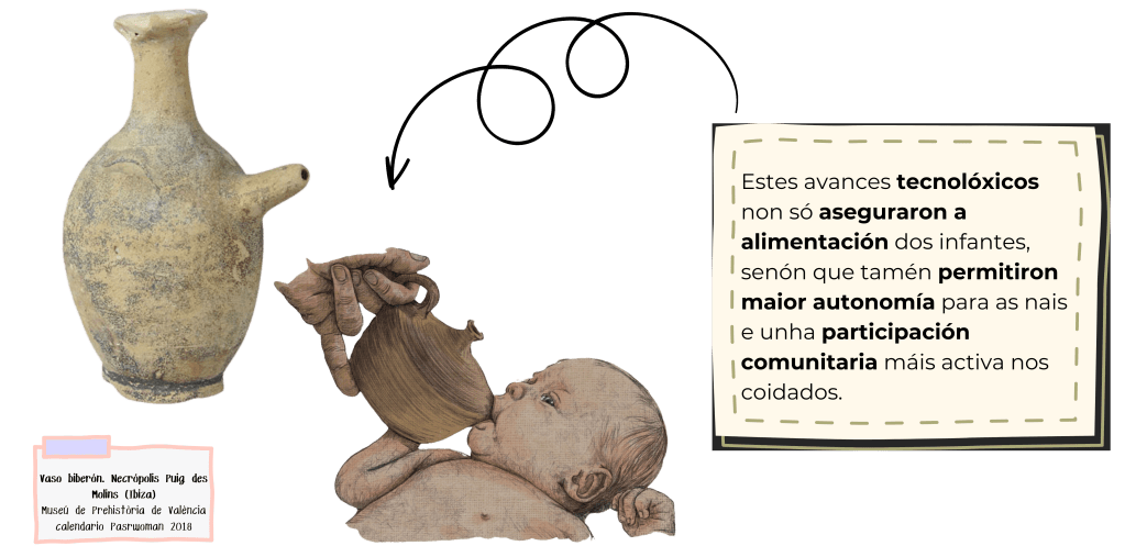 O coidado dos máis pequenos é crucial para a supervivencia de calquera grupo. Desde a lactación materna ata o uso de artefactos como biberóns de cerámica ou óso, as comunidades desenvolveron estratexias para alimentar aos nenos e as nenas.