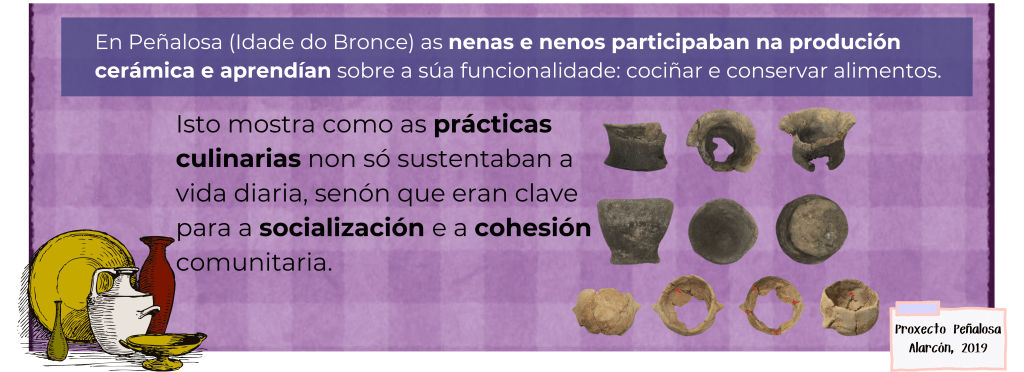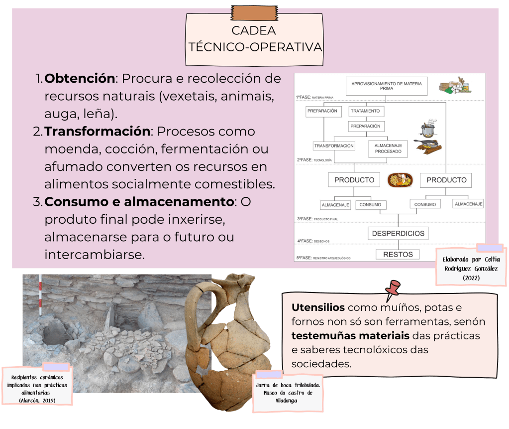 Existe unha conexión coa materialidade a través da creación e do uso de utensilios culinarios, como potas ou pedras de moer, que formaban parte esencial das prácticas de ensino.