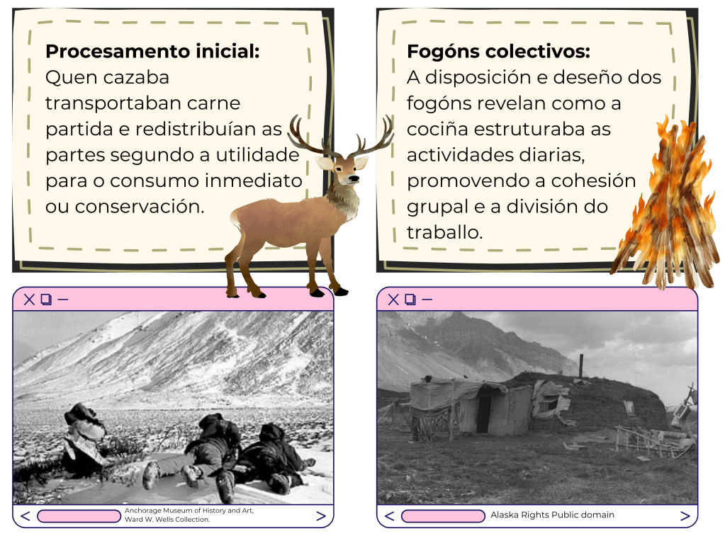 O caso dos Nunamiut (Alaska) destaca a cociña como eixo organizador. Nos campamentos, os restos de alimentos, fogóns e ferramentas de cociña mostran a importancia da organización loxística na alimentación (Bonomo et al. 2029).